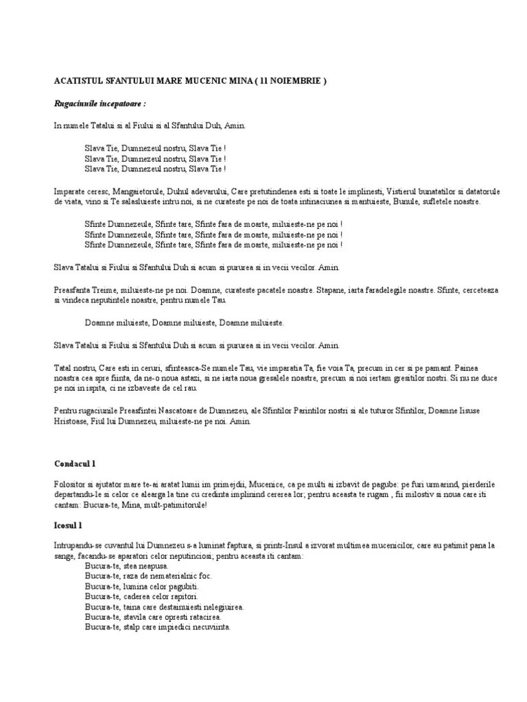 04.12.2019 · acatistul sf mina vă poate ajuta în când vă găsiți în moment de cumpănă sau impas, deoarece sfântul mina este considerat ocrotitorul celor păgubiți, dar și al familiei fericite.. Acatistul sfantului mare mucenic mina rugaciunile. Acatistul sfântului mare mucuenic mina (11 noiembrie) rugaciunile incepatoare: 04.12.2019 · acatistul sf mina vă poate ajuta în când vă găsiți în moment de cumpănă sau impas, deoarece sfântul mina este considerat ocrotitorul celor păgubiți, dar și al familiei fericite. Este sfantul care ii ocroteste pe pagubiti, se arata grabnic ajutator celor nedreptatiti in procese si celor ce au pierdut ceva sau au fost inselati. În ziua sărbătorii lui, pe 11 noimebrie, lumea creștină îl respectă cu sfințenie... 10.11.2020 · bun venit pe calea spre mântuire!